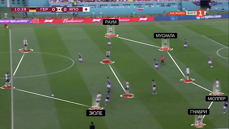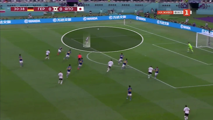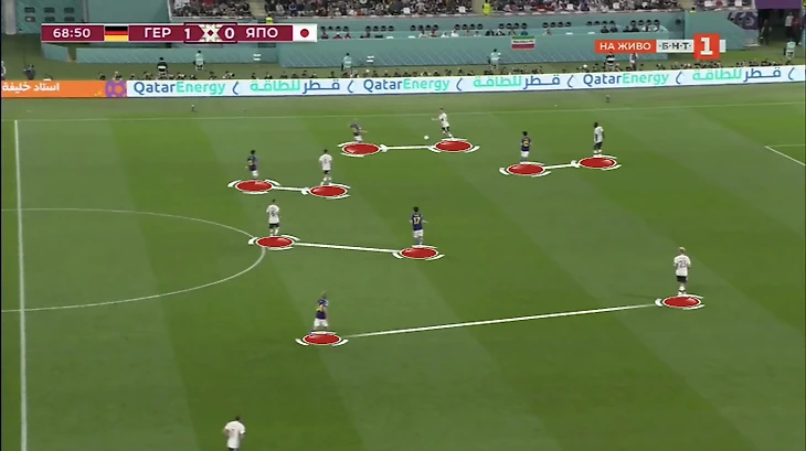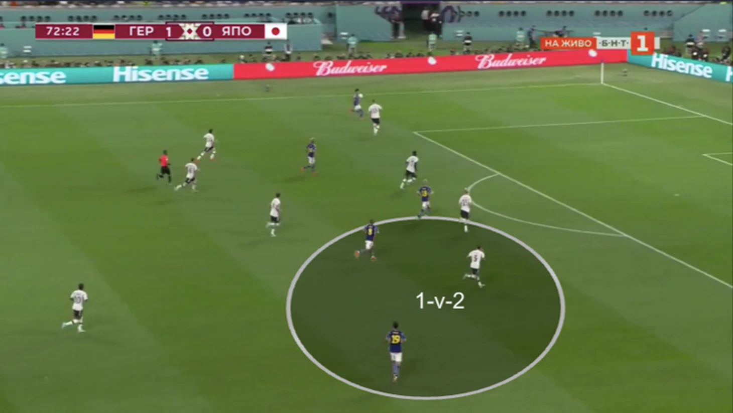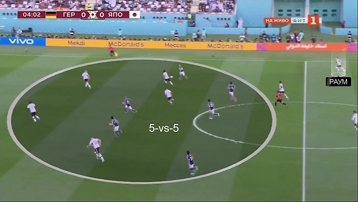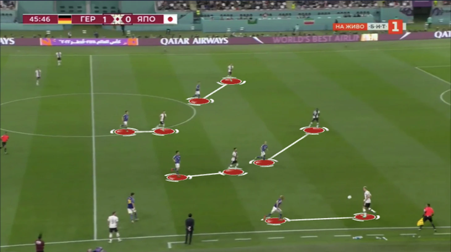 Схема с парой опорников и тройкой нападающих отлично наложилась на структуру розыгрышей Германии. Вместо того, чтобы отсиживаться в обороне, Япония начала высоко и смело прессинговать.