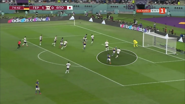 Из-за непонимания, как сдержать атакующую пятерку Германии, японцы категорически вжимались в штрафную – причем иногда буквально всей командой. Вот наглядный пример: