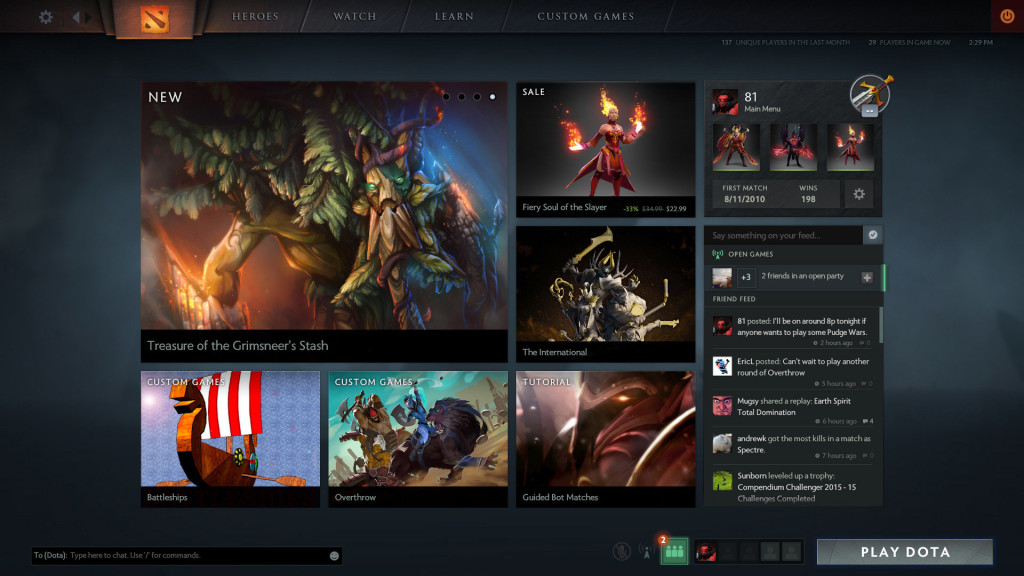 Дорогие мои любители Dota 2. Заранее прошу Вас не кидаться в меня камнями и не поливать грязью. Ибо некоторые мои мнения в корень рознятся от точки зрения большинства игроков.Итак, пройдемся по основным нововведениям. Стартовый экран, который мы увидим при запуске игры будет выглядеть так: