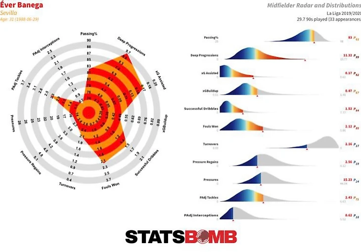 Уже ожидаемым + Банеги являются баланс, если ранний Банега был игрок играющий от позиции, в основном десятку, то позже он закрепился в качестве инсайда и глубинного плеймейкера. Трансфер в Интер и год проведённый там переквалифицировал его в более оборонительного игрока, с идеальной долей созидания (можно наблюдать на радаре ниже) и оборонительной работы.