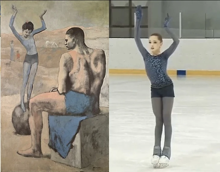 На самом деле, и фигуристка Камила Валиева и её короткая программа "девочка на шаре", оставленная, кстати, и в этом сезоне, довольно интересны. Приличная идея: сделать оммаж картины известного художника (Пикассо). Можно долго рассуждать и спорить с тем, есть ли в программе Валиевой что-то от картины, кроме воссозданной пластически первой позы, однако КП оставляет скорее приятные впечатления. Деликатно подобраны музыка и даже костюм, хотя и выглядит он довольно дёшево.
