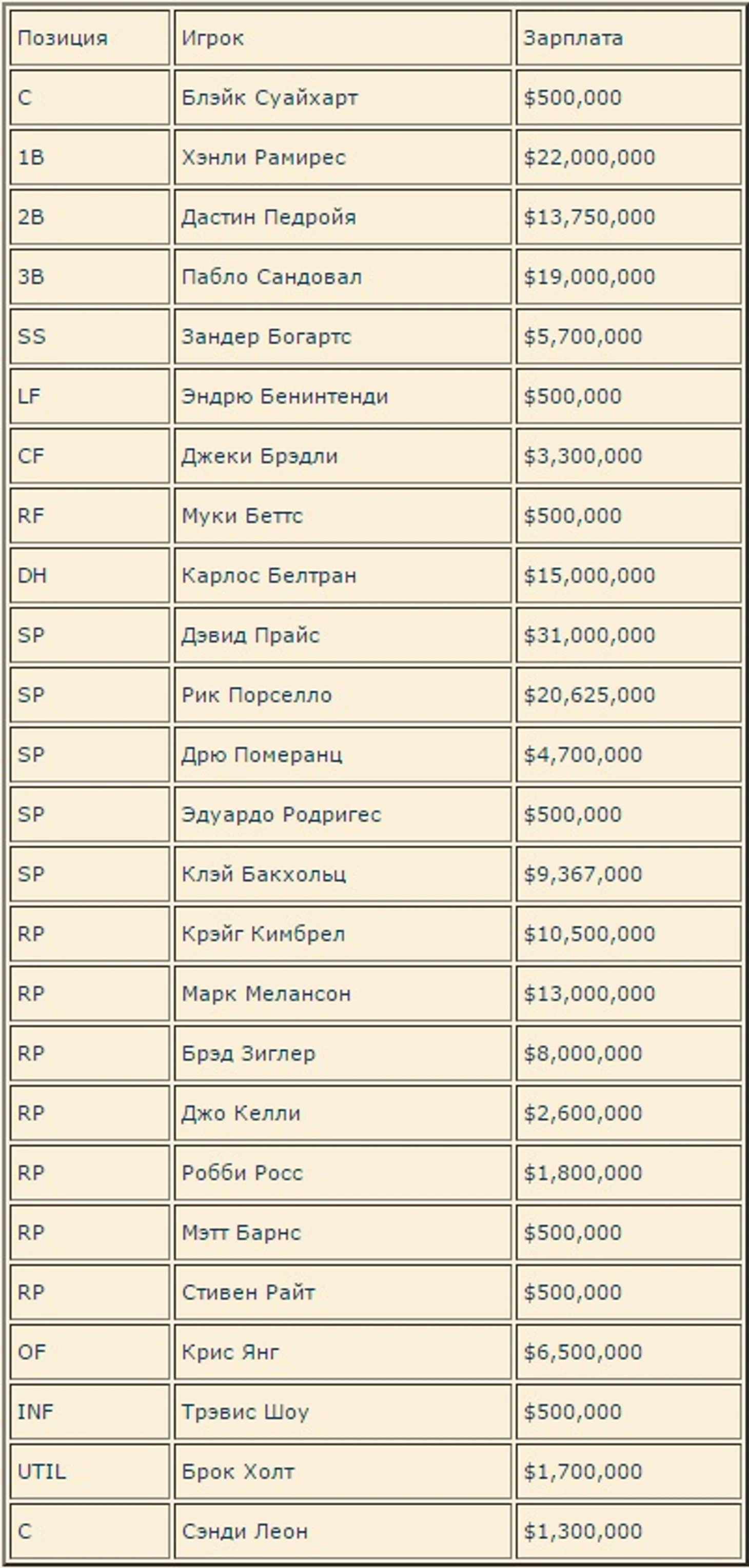 Ну и напоследок - идеальный для меня ростер Сокс (указана сумма годовой зарплаты, которая считается для luxury tax, то есть, средняя годовая зарплата по всему контракту, а не та, что игрок получит конкретно в 2017 году. Для новичков - приблизительные цифры, даже слегка завышенные на всякий случай, для тех, кому будет предложен арбитраж - прогноз MLBTradeRumors, для преарбитражных игроков - полмиллиона, копейки всё равно ни на что не влияют):