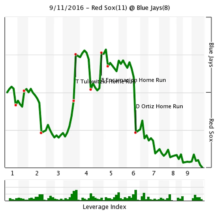 Чуть выше я рассуждал о том, что выводящий вперёд хоум-ран круче, чем уравнивающий счёт хоум-ран и последующий набор победного рана, потому что случается в один момент. Но что может быть ещё круче двухаутового хоум-рана, который превращает отставание в преимущество за пару секунд? Конечно, точно такой же хоум-ран, только выбитый не на выезде, а дома, оформляющий уок-офф победу. А ещё такому блюду не помешает немного "специй" - принципиальный соперник, чудесное спасение от "страховочных" ранов соперника перед отыгрышем, чуть большая длительность этого самого отыгрыша. Именно такое приперчённое блюдо подарили Сокс своим фанатам в один сентябрьский вечер. Как это было? Ну играли себе Сокс с Янкиз, до низа восьмого Сокс "благодаря" отличному питчингу Танаки проигрывали 5-1, потом Ортис хоум-раном пробил японского аса Янкиз и немного подсократил разрыв, вверху девятого Келли страйкаутом Хэдли и шаровым кэтчем лайнера Уильямса выпутался из ситуации с загруженными базами и 1 аутом, а уже внизу девятого начался самый цимес. Джирарди, как мог, пытался справиться без помощи Бетансеса, который и выходил в предыдущие два дня, и вообще против Сокс в этом сезоне валился безбожно, но когда Паркер при одном ауте попал мячом в Янга, а выходить на биту предстояло верху лайнапа Сокс, выбора у менеджера Янкиз уже не было - фаны и пресса съели бы его с потрохами, если бы ноунэймы пена Янкиз упустили победу, а топ-реливер отдыхал. Впрочем, в тот вечер уставший Бетансес бросал ничем не лучше ноунэймов - Педройя выработал уок, после аута Богартса синглы Папи и Муки сократили счёт до 1 рана, уайлд питч перевёл раннеров на вторую и третью базы, позволяя синглу выиграть игру... Но для Хэнли концовки сезона сингла было мало, поэтому он выбил бомбу в центрфилд, чем не только выиграл Сокс важнейшую игру, а и положил начало 11-игровой победной серии, которая закрыла вопрос о победителе AL East. Вот вам и бесспорный, по моему мнению, победитель этого хит-парада.