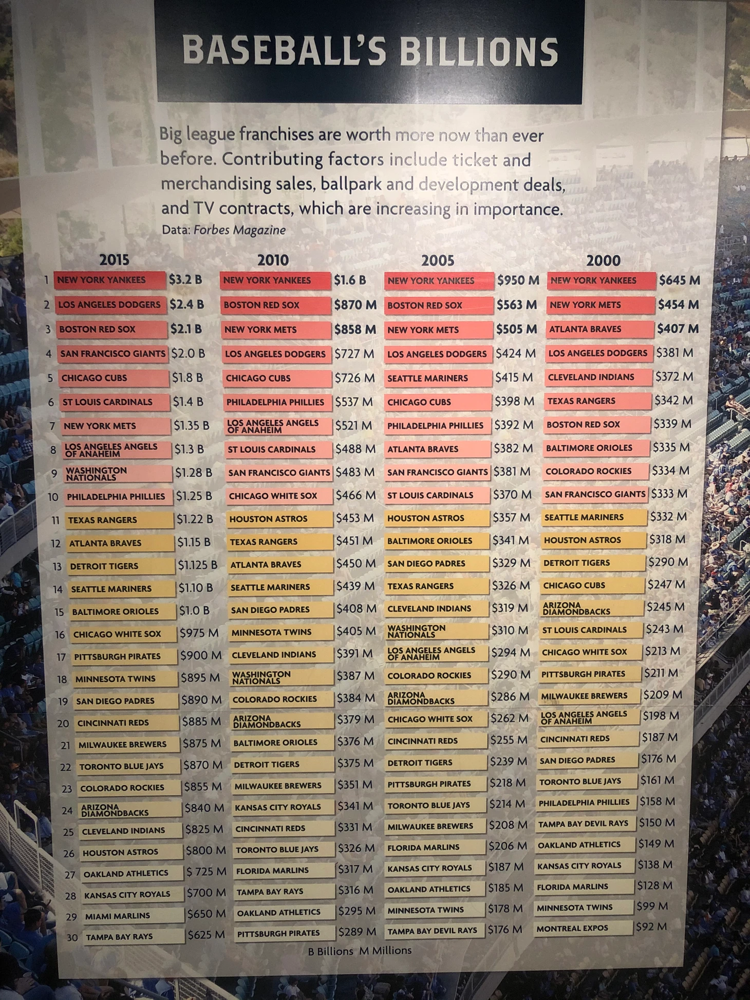 Обширная часть музея посвящена бейсбольной статистике. Вот, например, как изменялась стоимость бейсбольных клубов с 2000 по 2015 годы.