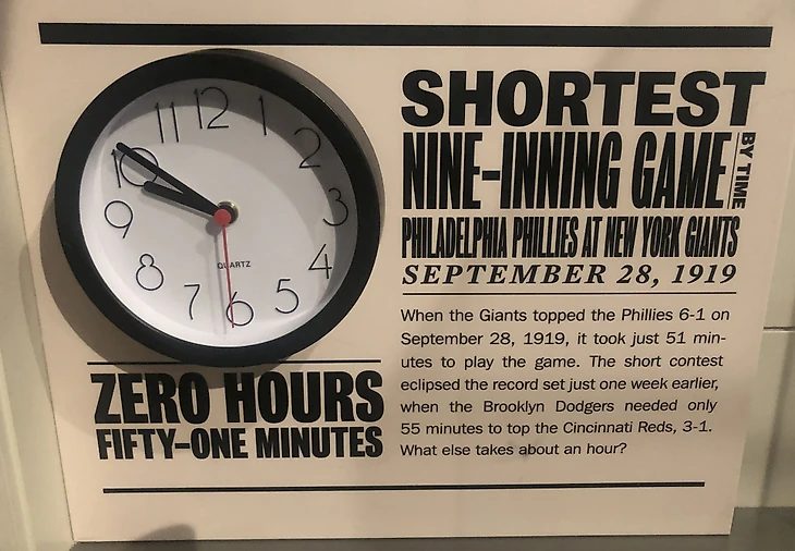 Самая короткая игра из 9 иннингов прошла в 1919 году, когда «Нью-Йорк Джаентс» победили «Филадельфию Филлис» 6-1, затратив только 51 минуту.