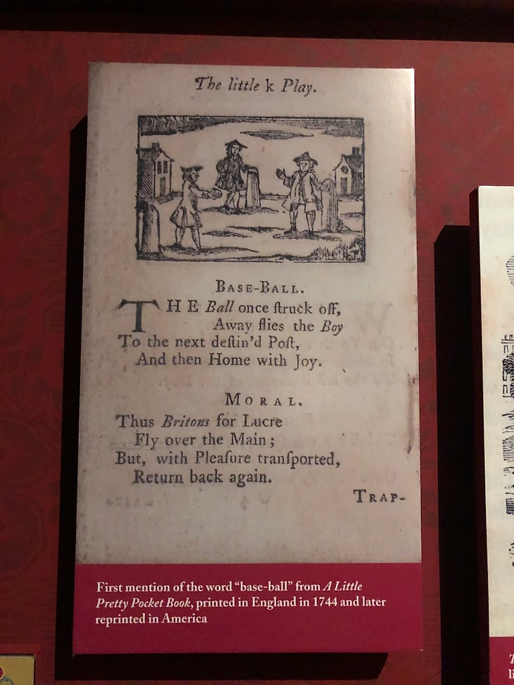 Об истории бейсбола говорится в первой экспозиции музея. Показываются первые упоминания об игре по имени «бейс-бол» в Англии, гравюры со схожей игрой во Франции, первые игры по бейсболу в США, проходившие во время ярмарок.