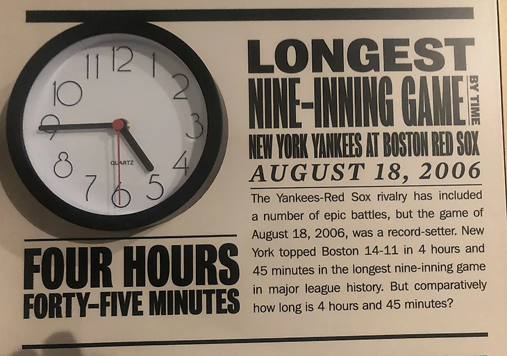 Многим известно, что бейсбольный матч занимает много времени. Самая продолжительная игра в истории, состоящая из 9 иннингов, проведена в 2006 году. «Нью-Йорк Янкис» победил «Бостон Ред Сокс» 14-11 за 4 часа 45 минут.