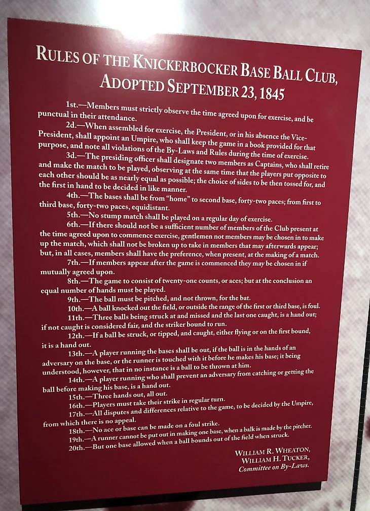 В 1945 году Александром Картрайтом, членом бейсбольного клуба Кникербокер, разработан первый свод правил для игры в бейсбол, которые легли в основу современных правил. Свод состоял из 20 пунктов, первый из которых гласил: «Участники должны строго соблюдать согласованное время для упражнений и быть пунктуальными при посещении».