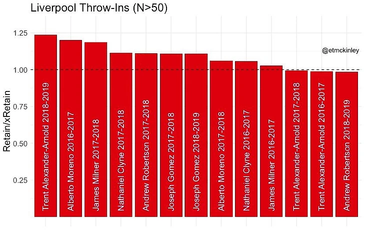Интересно, что значительного статистического прогресса достиг только Трент Александр-Арнольд, а Робертсон, например, достаточно сильно регрессировал. Это объяснимо: в среднем, именно вбрасывания со стороны Арнольда рассчитаны на сохранение владения, так как с этой стороны играет достаточно высоко располагающийся Салах, и зачастую Арнольд просто разыгрывает с ближним игроком. В то же время со стороны Робертсона вбрасывания более агрессивные, потому что рядом всегда один из тройки полузащитников и Мане, поэтому есть возможность продвинуть атаку именно через вбрасывание: