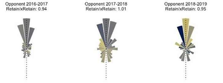 Вбрасывания мяча соперниками «Ливерпуля» в последних трех сезонах. Показатель Retain/xRetain описывает отношение реального владения мяча к ожидаемому владению. Показатель меньше единицы будет означать, что против клуба вбрасывают мяч в среднем хуже, чем другие команды лиги. Чем темнее цвет линии, тем меньше процент успешных вбрасываний, чем светлее – тем выше.