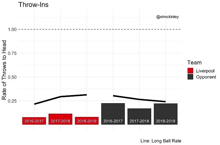 Три столбца слева – это процент вбрасываний «Ливерпуля», приходящихся на голову партнеру за последние три года. Справа – то же самое, но у соперников «Ливерпуля». Черная линия означает процент лонгболлов «Ливерпулем» и оппонентами.