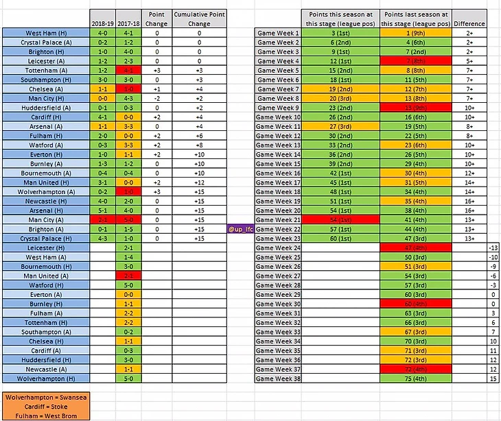 Левая таблица: «Ливерпуль» в сезонах-2017/18 и 2018/19 и их результаты против одних и тех же соперников, а также изменение набранных очков по сравнению с теми же матчами прошлого года. Правая таблица: очки клуба и позиция в чемпионате в двух сезонах.