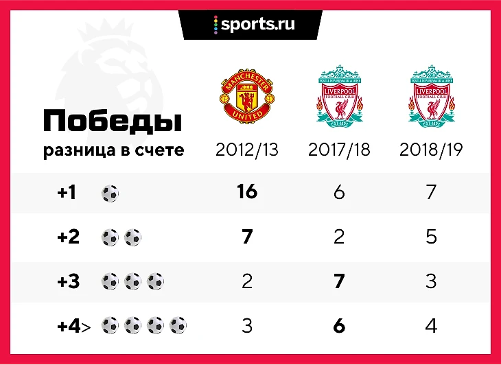 «Ливерпуль» за весь сезон-2017/18 одержал всего на две победы больше, чем сейчас к концу января (впереди почти половина сезона). И большая часть побед-2018/19 – с маленькой разницей мячей. Здесь опять легкое сходство с фергюсоновским «Юнайтед»: в последний сезон в клубе шотландец стал чемпионом, победив с разницей в один мяч 16 раз из 28.