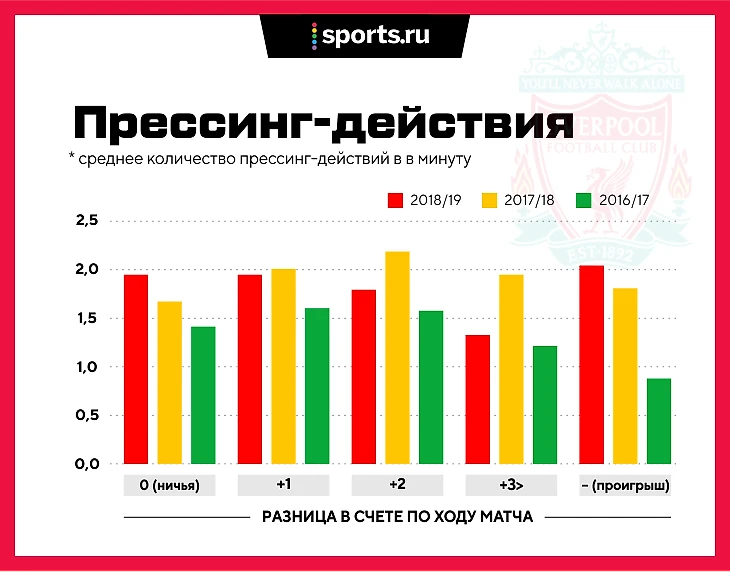 «Ливерпуль» теперь иначе реагирует на ситуацию на поле. Это заметно по статистике прессинга. Если раньше мерсисайдцы усиливали давление, когда начинали побеждать (что немного странно), то теперь наоборот – отключают прессинг после второго гола. Учитывая, что в этом сезоне «Ливерпуль» лишь дважды пропустил больше одного мяча (против «Сити» и «Пэлас»), это вполне логично: