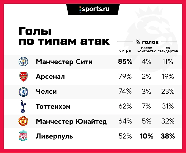 Как итог – стилистически «Ливерпуль» свободнее любой другой команды из топ-6 АПЛ. Голы равномерно распределены по всем типам атак – у «Сити» так не получается.