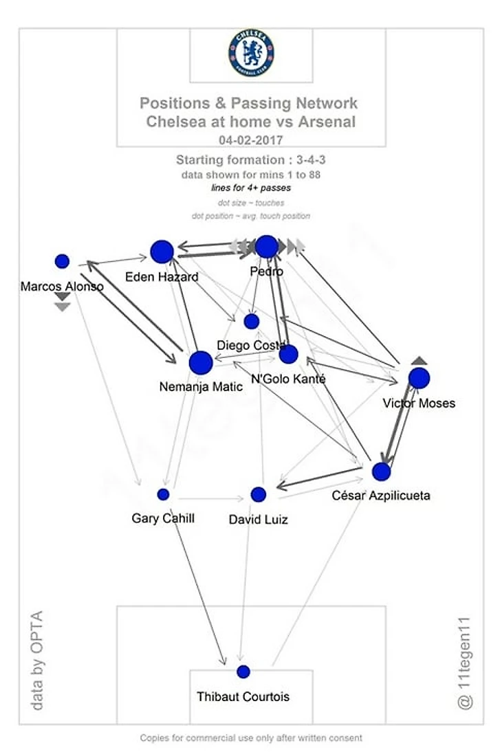 После трансфера в «Челси» Канте несколько туров играл единственного опорного в схеме 4-3-3. Тогда Конте использовал Канте позади Матича и Оскара, которые играли восьмерок. Прямо скажем, это был не лучший период: «Челси» одержал три победы в первых шести турах, проиграл «Ливерпулю» и «Арсеналу», после этого Конте перешел на 3-4-3.