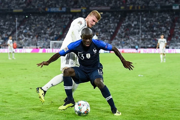 Расположение Канте в сборной ничем не отличается, Дешам тоже не наигрывает его как единственного опорного, только в двойке – либо в схеме 4-2-3-1, либо в 4-4-2. Неудивительно, что пару Канте в этих формациях составляет Поль Погба, который разительно отличается от Нголо по всем характеристикам: при развитии атак мяч достается именно Полю, а Канте больше сосредоточен на обороне. Такое распределение обязанностей не значит, что Канте не участвует в атаках, но оно позволяет прикрыть проблему француза с первым пасом.