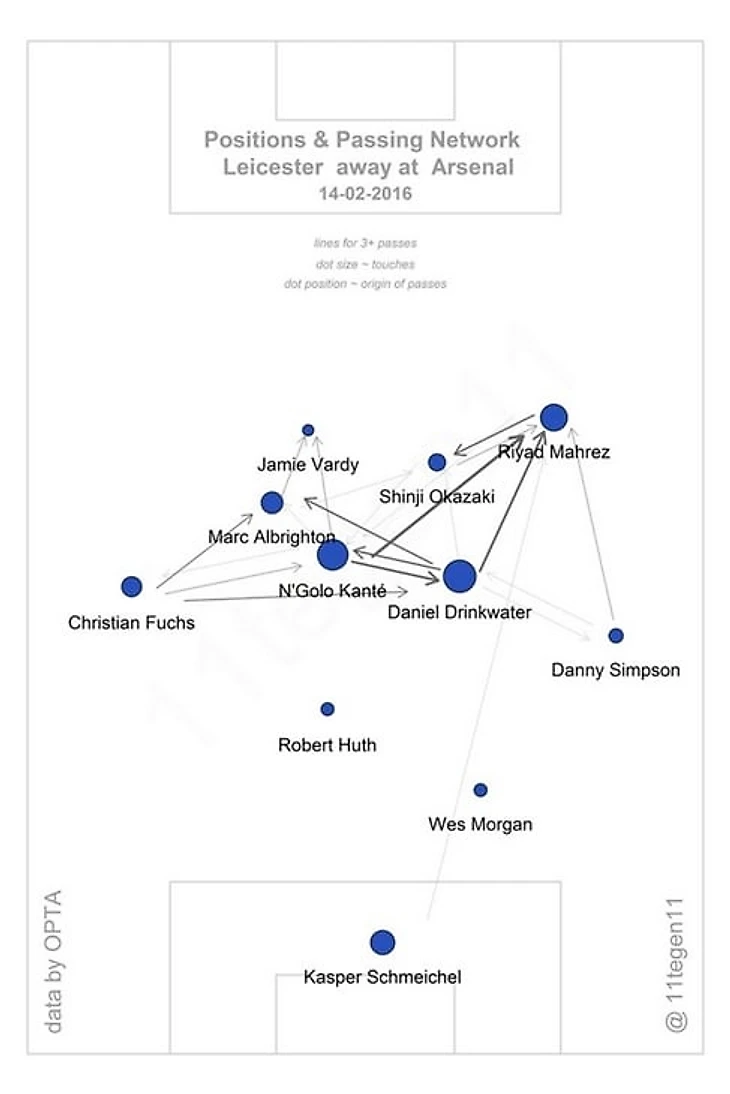 Карта со средними позициями игроков «Лестера» в матче против «Арсенала» (1:2).