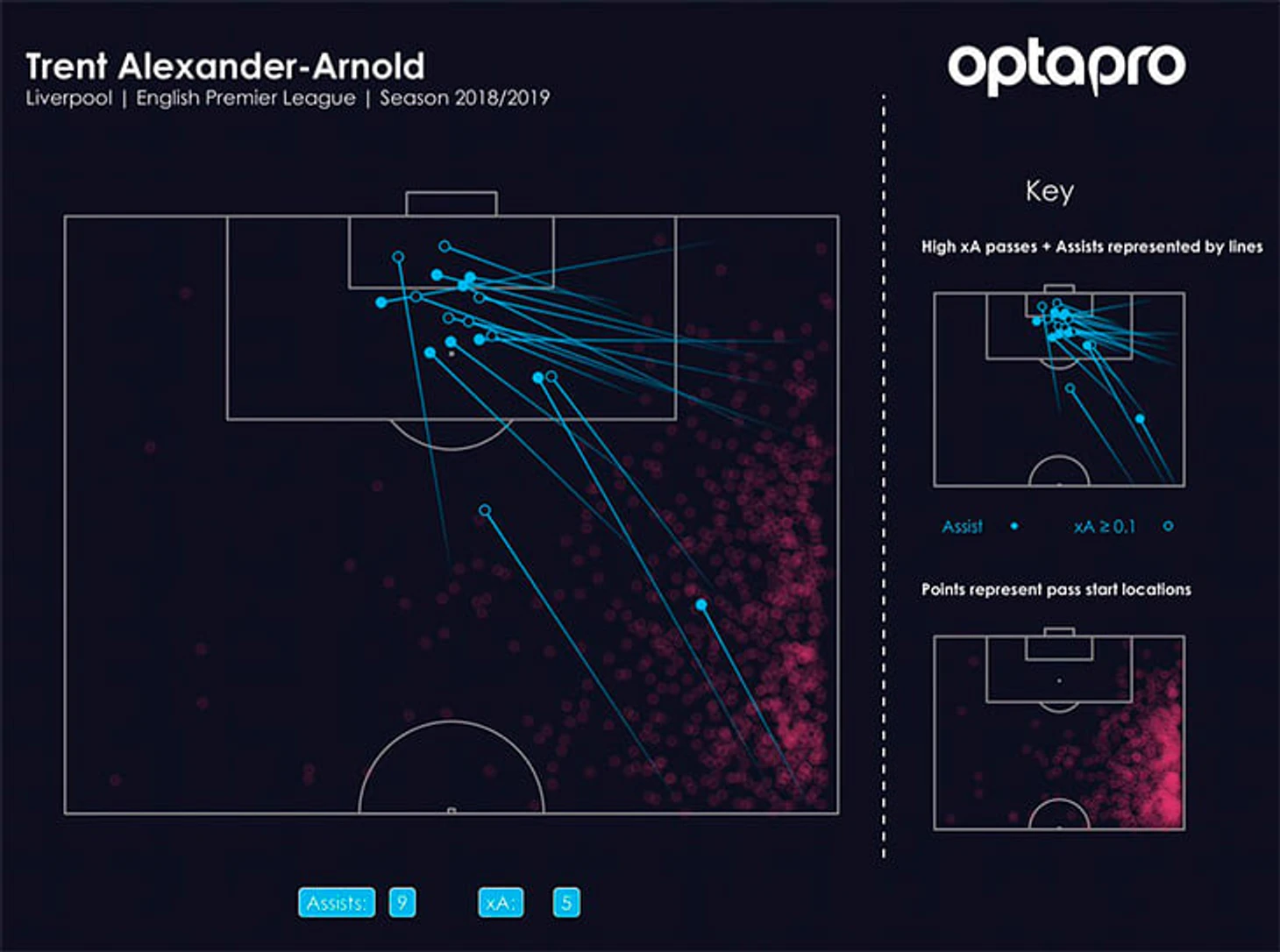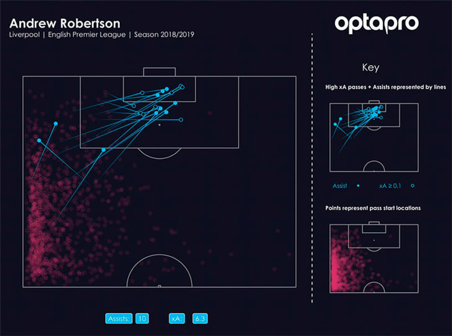 Карта касаний и ассистов ТАА и Робертсона на чужой половине поля. Красным отмечено место, с которого они отдавали пас, синими линиями – передачи, приведшие к опасному удару или голу.