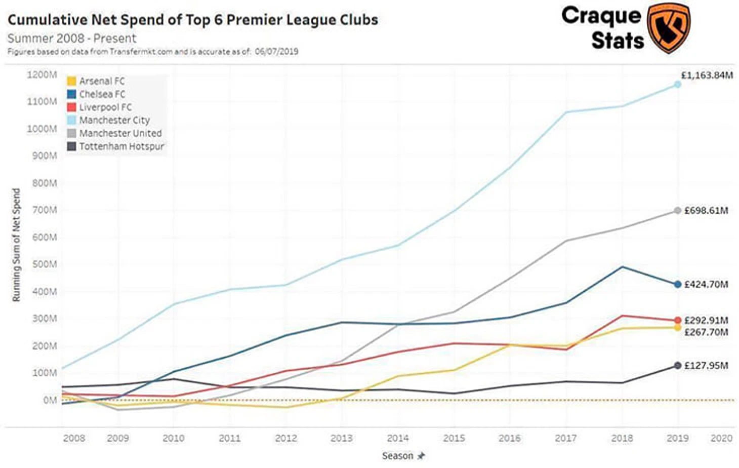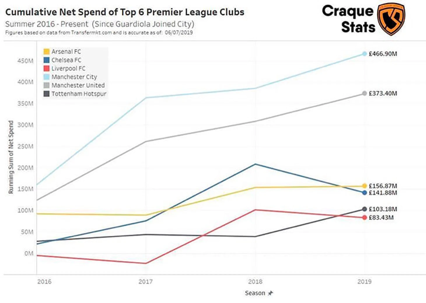 Размер этого финансового рычага легко увидеть. Только при Гвардиоле чистые расходы клубов большой шестерки выглядят вот так: