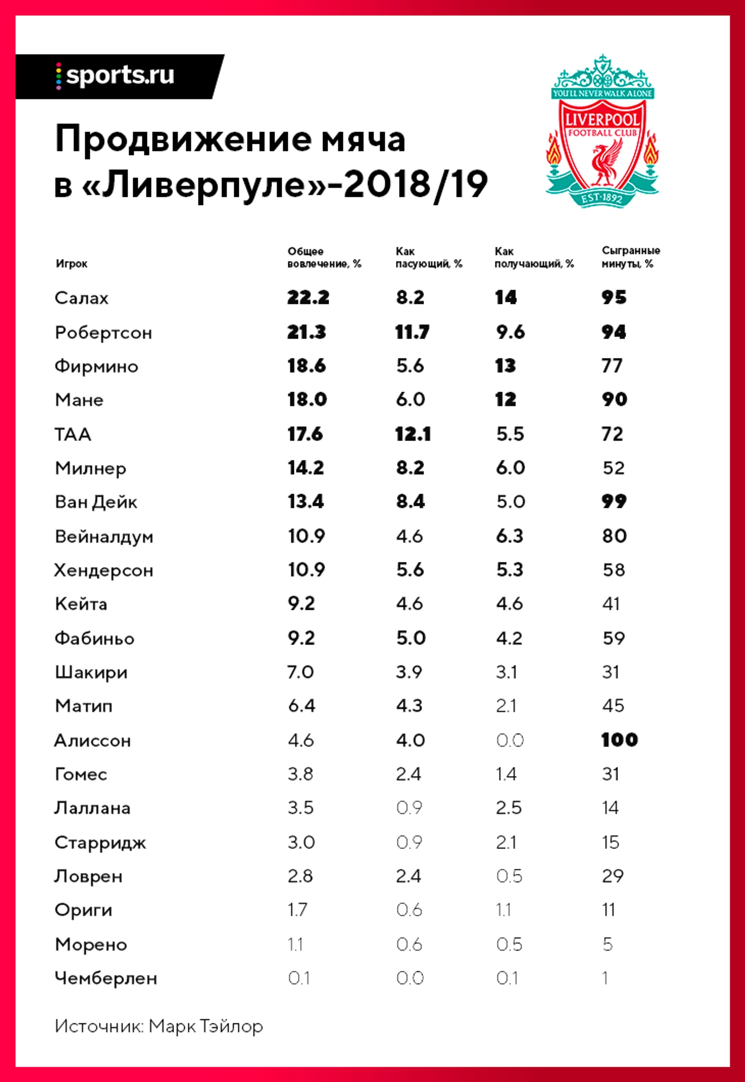 Для сравнения: самый продвигающий мяч игрок «МЮ» – Погба, «Арсенала» – Джака, «Челси» – Азар, «Сити» – де Брюйне. По большей части все они играют выше, чем крайние защитники. Единственный клуб из топ-6, где ситуация такая же, как в «Ливерпуле» — «Тоттенхэм», там главный игрок в продвижении мяча – правый защитник Киран Триппьер. Учитывая, что «шпоры» часто играли в три защитника, а сам Триппьер несколько матчей играл даже правого полузащитника, это не кажется таким неожиданным – его цифры оказались смазанными из-за более высокой средней позиции.
