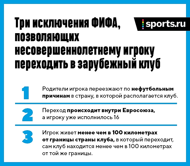 ФИФА жестко относится к нарушениям при регистрации несовершеннолетних: пункт 19 трансферных правил запрещает переходы таких игроков между клубами из разных стран. Однако есть три больших исключения, каждое из которых позволяет игроку перейти в зарубежный клуб: