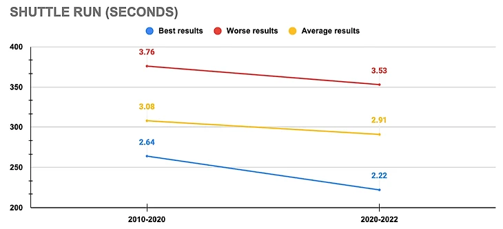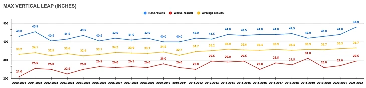В прыжковых тестах средние результаты разнятся сильнее всего — это показывает, что игроки активнее всего прогрессируют в этом направлении. Худшие результаты значительно улучшаются с годами, что говорит об общем увеличении прыжка даже для наименее физически одаренных атлетов.