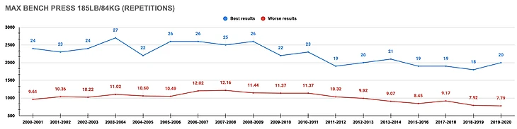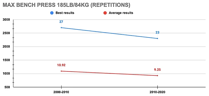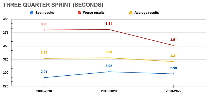 Единственный тест, где лучшие и средние показатели уменьшаются на протяжении времени. Разница между двумя десятилетиями составляет 15,2%. Это не обязательно говорит о том, что игроки становятся слабее в силовом плане, но они теперь меньше внимания уделяют жиму лежа, а больше — непосредственно тем вещам, которые они делают на площадке.