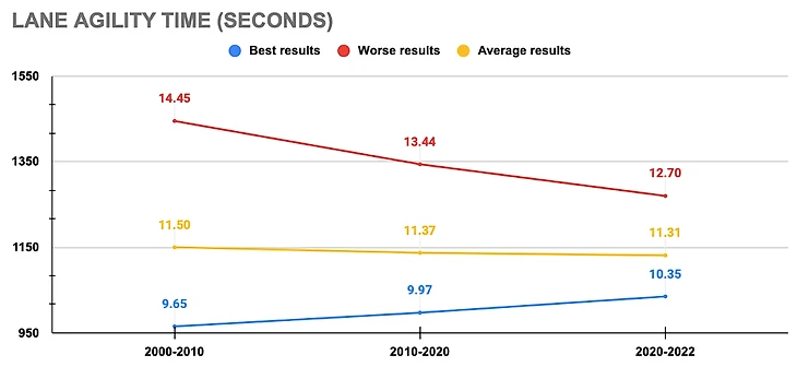 Для отслеживания динамики результатов я сравнивал лучшие, худшие и средние показатели за каждый сезон отдельно, а также за временной промежуток в десять лет — соответственно, 2000-2009, 2010-2019 и 2020-2021. Уникальные атлеты, которые показывали фантастические результаты и устанавливали рекорды в отдельных тестах, появлялись в нулевых, десятых и в двадцатых годах, поэтому для оценки показателей за долгий промежуток времени сравнивались результаты всех игроков, сдающих определенный тест, и выводились средние значения, а также оценивались худшие результаты.
