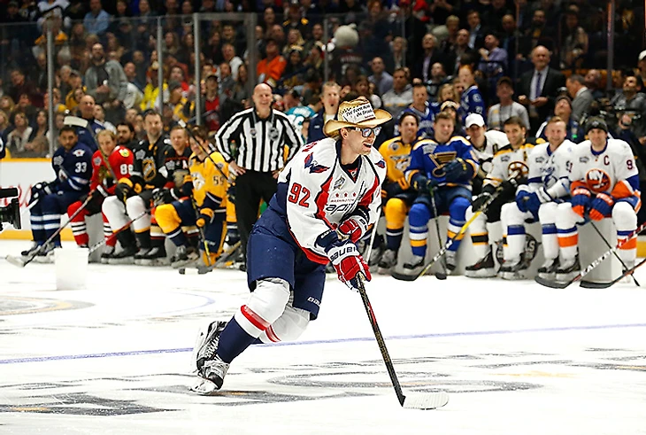 Евгений Кузнецов нахлобучил на голову ковбойскую шляпу, надел дурацкие очки, разрисованные в стиле кантри, заставил Никласа Бэкстрема залить ему в горло пепси. Взял непривычную клюшку с правым хватом, чтобы во всем скопировать Овечкина 7-летней давности и поехал исполнять буллит.