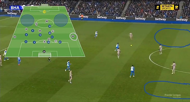 Продолжаем разгребать кучу с матчами в предновогодний период. На очереди матч Брайтон-Тоттенхэм, который получился очень крутым для зрителя, причем как подкованного, так и нет. Именно в этом матче вылезли все проблемы Тоттенхэма наглядно, но давайте по порядку. Как и Брайтон, так и Тоттенхэм очень любят как играть с мячом, так и интенсивно его забирать, поэтому уже с первых минут чувствовалась борьба за владение, почти каждую минуту был эпизод с прессингом и с тем, как команды по очереди пытались его преодолевать. Да, не без ошибок, но порой получалось очень классно. У ТТХ, надо отметить получалось лучше, Брайтон ошибался чаще, но «шпоры» не могли ничего извлечь из этого, но об этом позже. Кстати если кто-то хочет посмотреть на пример такого выхода из-под прессинга в видеоформате, то переходите в одноименную телеграмм-группу, ссылка в описании к блогу. Теперь более подробно к гостям. При атаке уже на половине поля Брайтона, ТТХ выстраивался в свой билдап, по сути 2-3-5 должно получаться. Ничего особенно новаторского, так сейчас много, кто делает. Но знаете самый главный минус такого билдапа? Тут ни при каких обстоятельствах нельяз терять мяч внизу, иначе получается так, что зоны крайних защитников оголены (синие зоны на картинке), так как они высоко, посмотрите где Удогие его даже в кадре не видно (серый кружок).