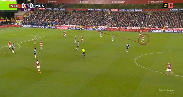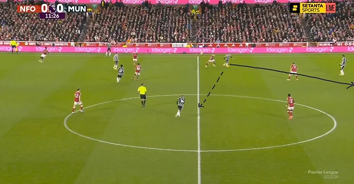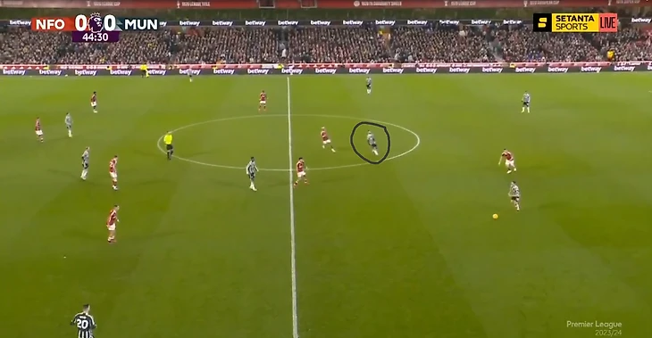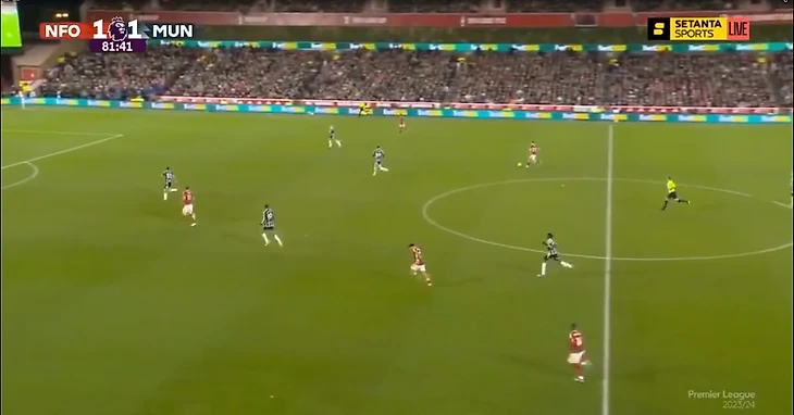 Первый тайм так и закончился по нулям. Ноттингем даже поинтереснее выглядел, потому что играл от простого. Пытался снабжать мяч в штрафную, где игроки МЮ пару раз «пожарили». Кстати в конце тайма уже и Бруно от безысходности решил опуститься вниз для получения мяча, но так передачи и не дождался. Ну конечно, о какой передаче может идти речь, если сзади висит игрок