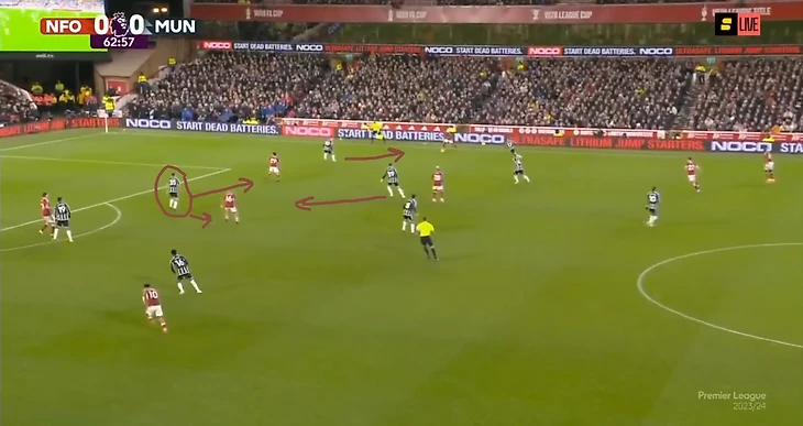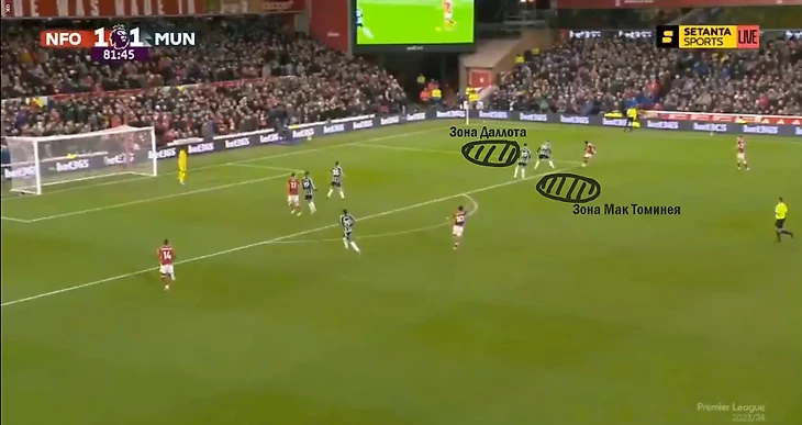Ну единственное, что могу отметить у «дьяволов» удар в штангу от Даллота, но это был бы шедевр индивидуального мастерства, нежели командная какая-то комбинация. А вот Ноттингем взял и сделал то, что по сути должно было делать МЮ. Тихим сапом взяли мяч под контроль (там Рэшфорду оказывали помощь, поэтому было большинство) и забили гол. Причем посмотрите как легко. Во-первых опорник, как ему и полагается пришел к 2-м центральным защитникам, забрал мяч и отдал хорошую обостряющую передачу (а не назад вратарю). Смотрите на картинке. В динамике на видео можно посмотреть в телеграмм-канале тут.