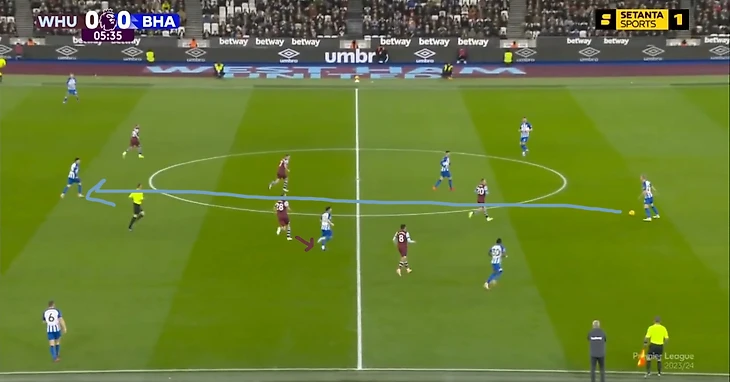 А дальше включается в дело обычная математика: если в одной зоне скопилось слишком много игроков соперника, значит в другой зоне их будет не хватать и можно воспользоваться численным преимуществом. Если смотреть на картинку выше, то это зона слева от Брайтона у номера 30. Вот как-то так работает владение Брайтона. Переходя уже основательно на половину поля соперника Брайтон по сути ничего и не меняет в своей, так сказать, стратегии. Они также пытаются вытянуть игроков из оборонительного блока, чтобы потом заиграть ту открывшуюся зону. Вот пример, допустим, Брайтон засчет движения и перепаса спровоцировал выдвижение опорника Вест Хэма Соучека (указала бордовой стрелочкой). Тем самым освободилась передача на другого игрока (синяя стрелочка), центральный защитник ее и сделал. Для большей наглядности можете посмотреть видео в одноименной к блогу телеграмм-группе, перейдя по ссылке на пост с разбором.
