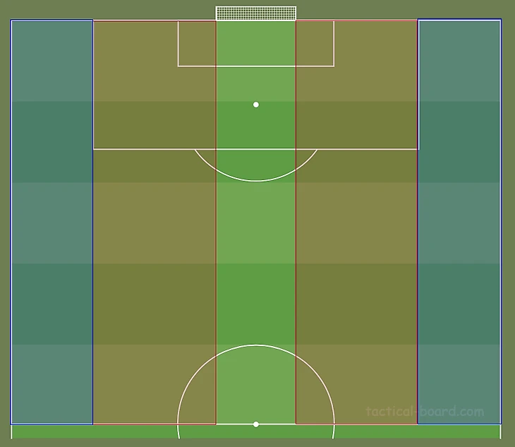 Понятно, что это не всегда так работает, далеко не всегда. Если бы это постоянно проходило, то каждая атака заканчивалась бы голом. Но давайте не будем забывать, что это футбол, это не тактическая доска, на которой можно двигать фишки как угодно. Тут есть человеческий фактор, фактор ошибок, движения и идеи игроков соперников, поле, мяч, техника и кучу других переменных, влияющих на конечный исход атаки. Но когда все складывается в пользу Брайтона, то они создают момент или забивают гол. Еще заметил очень интересную деталь в атакующих действиях Брайтона. Причем эта особенность именно в заключительной стадии атаке. Начнем с того, что поле на схеме можно разделить условно вертикально на части, которые часто называют полуфланги (красные зоны) и фланги (синие зоны).