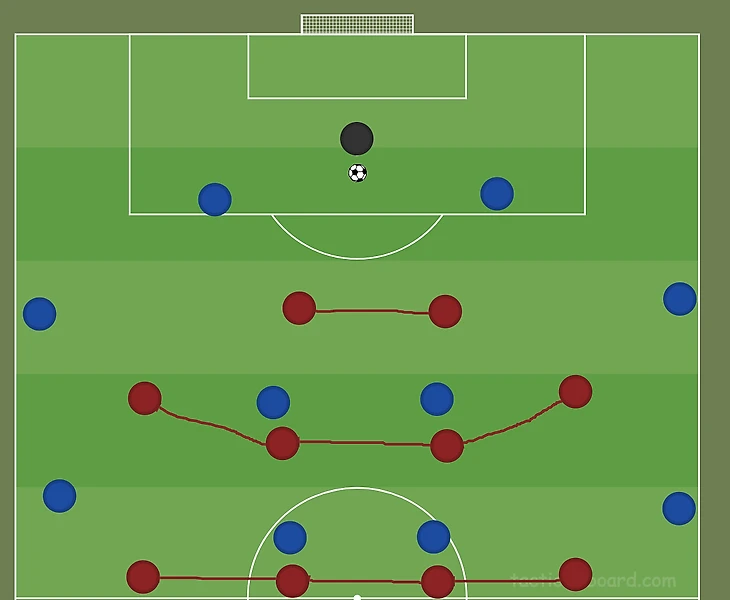Это первая отличительная черта игры Брайтона. Поднимаемся выше, в зону развития атаки, когда Брайтон уже не пытается преодолеть прессинг, а пытается взломать оборону, зачастую, как все думают «просто катают мяч». Но это чуть-чуть не так, не просто катают. Зачастую многие замечают в игре Брайтона, что они могут подолгу перекатывать мяч, а иногда и вообще стоять с этим мячом на месте. Это с одной стороны кажется скучно, непонятно зачем, но если я вам скажу, что они делают это специально. Любой оборонительный блок состоит из линий и цепей, а также имеет узкое расположение, это сделано для того, чтобы мяч не проходил между линиями, так как это самая опасная передача (наикротчайший путь к воротам, через центр). Вот очень просто и схематично на примере системы 4-4-2: