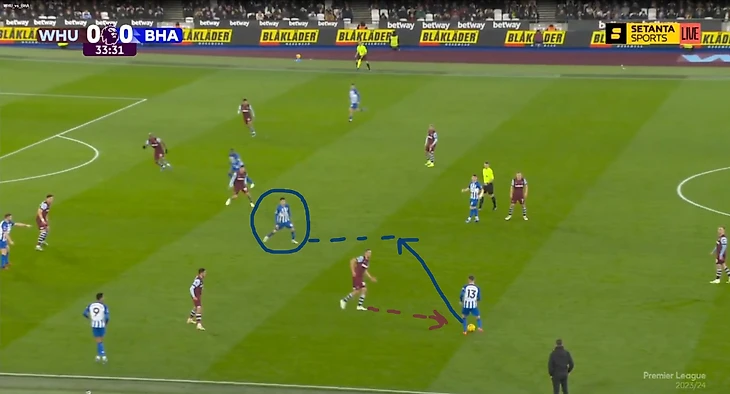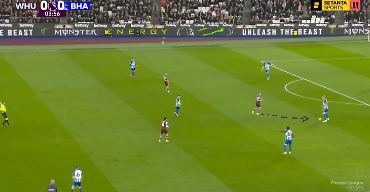 2 января нового 2024-го года Вест Хэм принимал Брайтон. Игра закончилась 0-0, и с первого взгляда не имела ничего интересного, но даже смотря на статистику владения 70 на 30 в пользу гостей, можно понять, что Брайтон был почти всю игру на мяче. И вот по сути идеальный матч для рассмотрения главной идеи футбола Брайтона при Де Дзерби. Начнем с удара от ворот, именно с этого стандартного положения зачастую начинается владение мячом и построение будущей атаки Брайтона. Вот типичная картинка при ударе от ворот в исполнении «чаек».