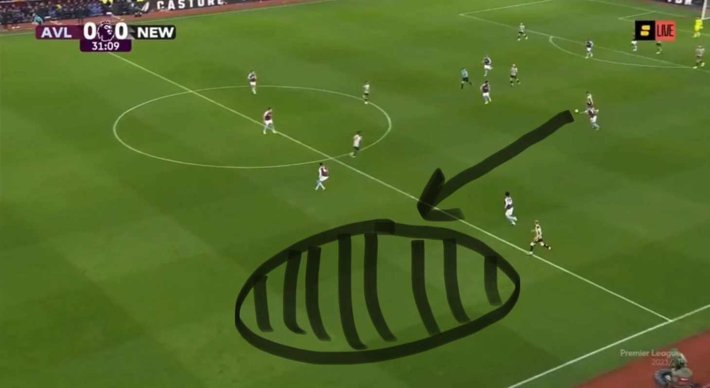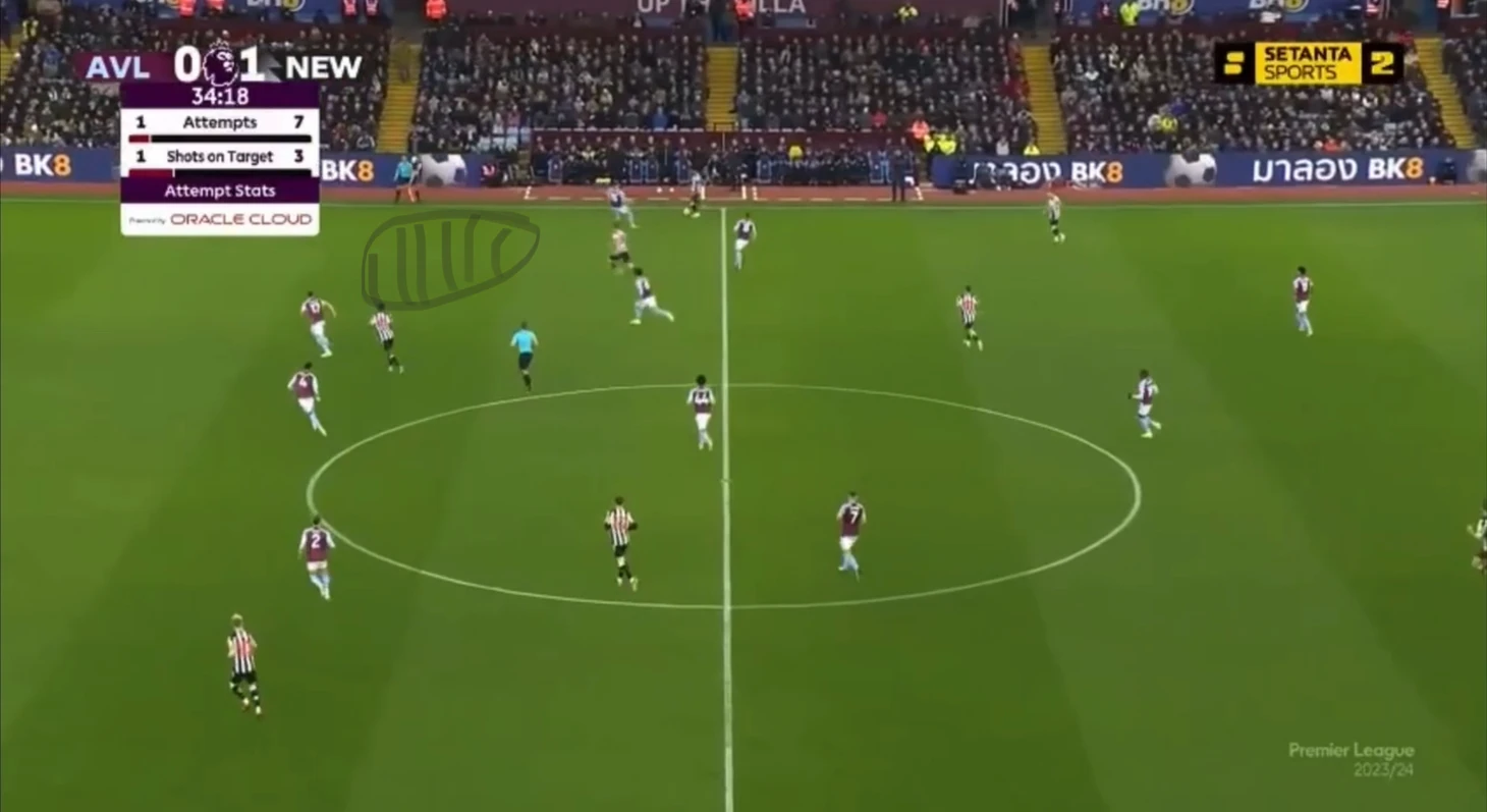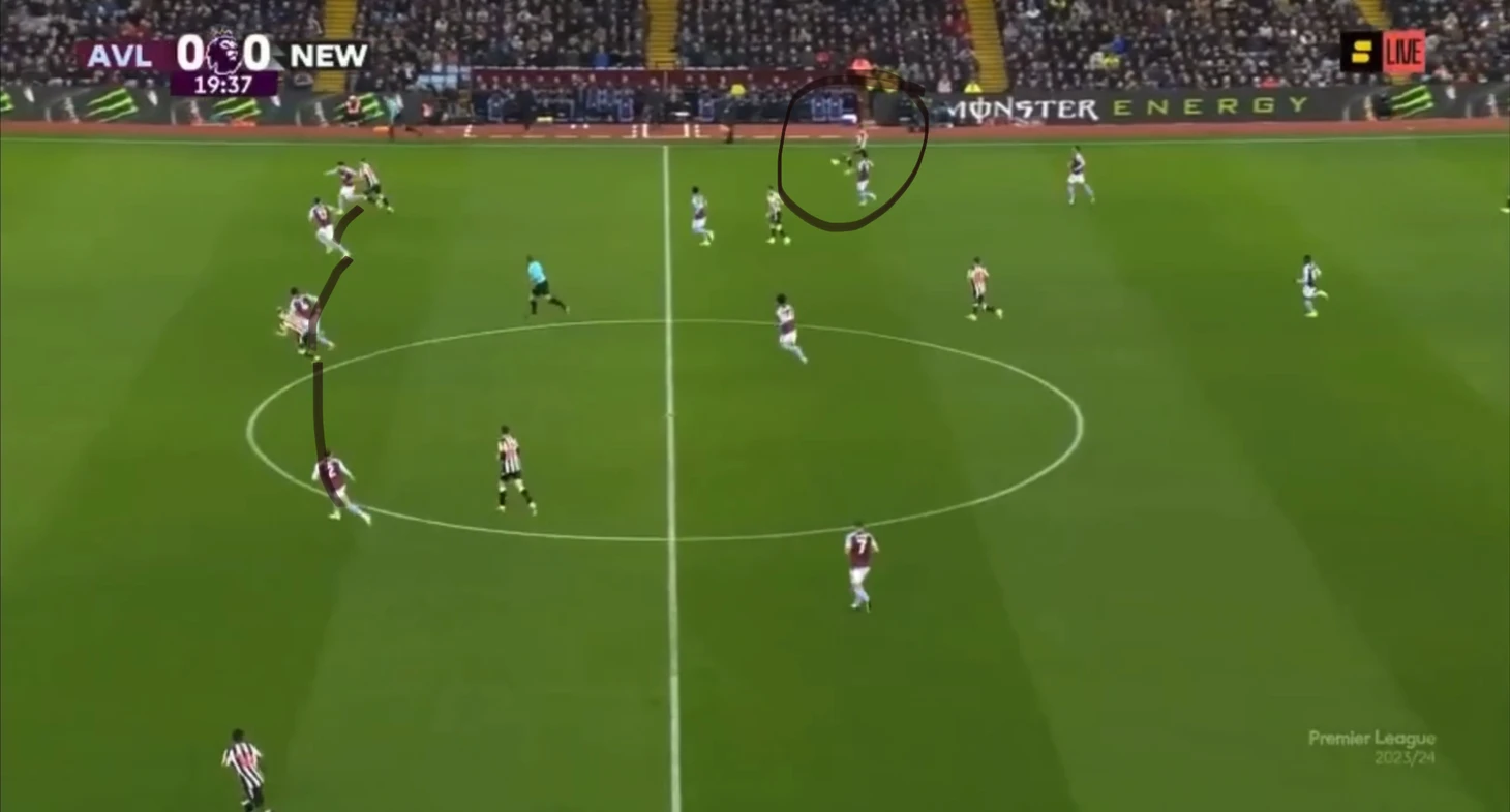 Особенностью игры в обороне Астон Виллы, является то, что они круто перестраиваются. Я как-то разбирал их действия в защите и именно благодаря тому, что опорные защитники доигрывают до конца со своими визави подопечные Эмери и добивались крутых результатов с командами, которые долго владеют мячом (Брайтон, Сити, Ливерпуль). А вот проблемы возникают тогда, когда команда пытается сыграть быстро, моментально вскрыть фланг, которым атакует, тогда у «вилловцев» возникают трудности. Как раз этим Ньюкасл и воспользовался, когда зарабатывал второй голевой угловой. Забегание в зону за спиной крайнего защитника с последующей передачей раз