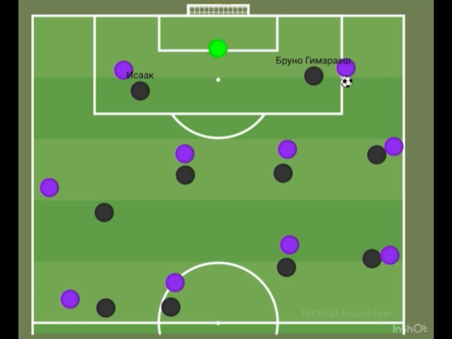 Механизм прессинга начинался с того, что Ньюкасл перестраивался в 2 форварда — Гимараеш поднимался вверх. Потом шло движение со стороны центрального защитника хозяев на вратаря. Если мяч и доходил до центрального защитника, то «сороки» разбирали всех персонально. Более схематично это выглядело так