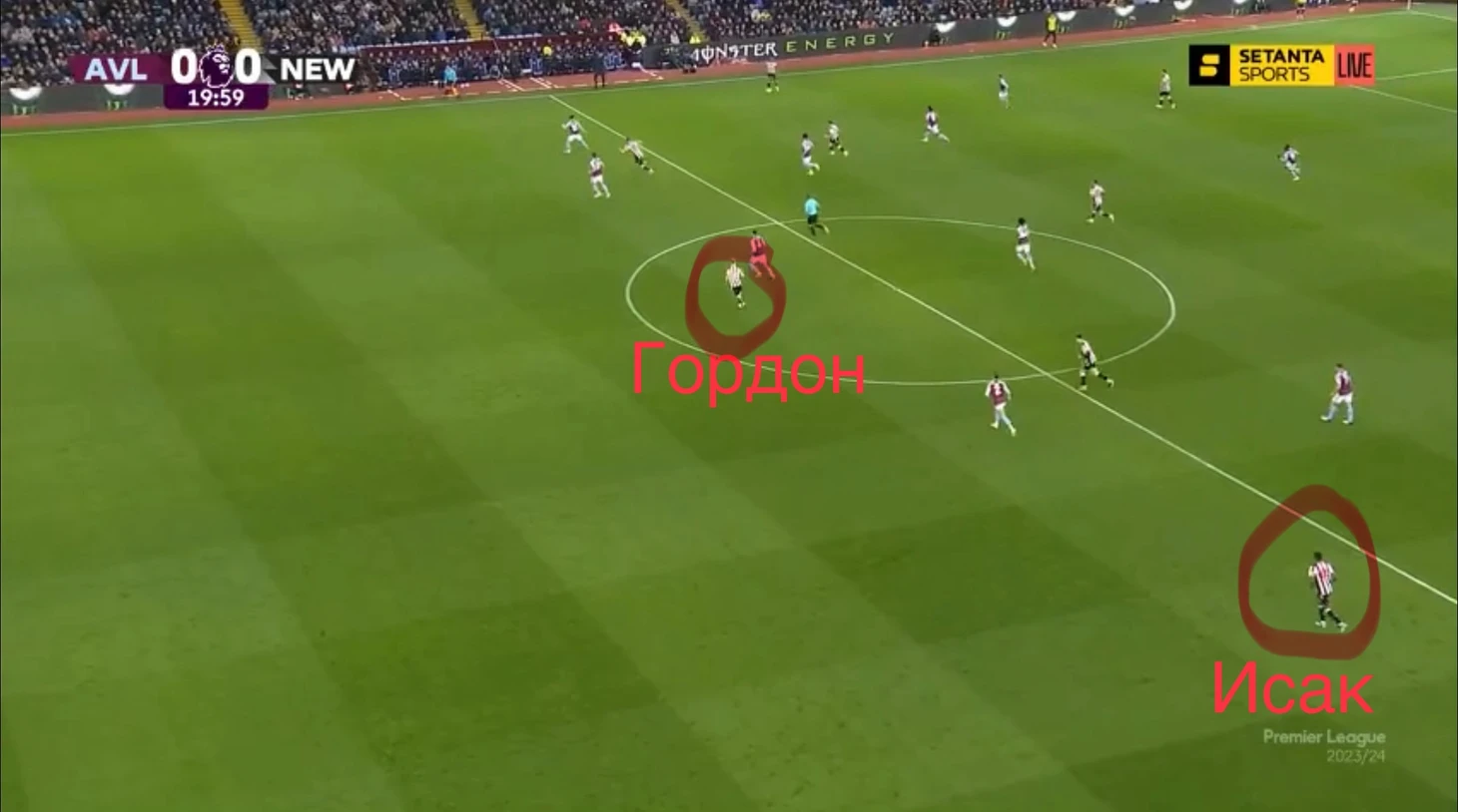 И вот это как раз тот самый первый недостаток, которым воспользовались «сороки». Так самое интересное, что Ньюкасл не просто бил за спину бездумно. Обратите внимание на позицию Исака. Он зачастую оказывался слева на фланге, когда Гордон был в центре, чтобы спокойно открываться за спину защитникам и «уезжать от них на мопеде». Вот вам картинка для примера. Кстати в телеграмм-канале публиковал пост про это все, только с видео-фрагментами и пояснениями.