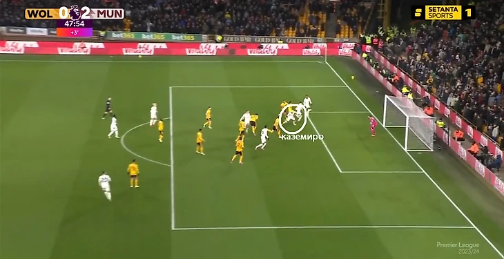 Еще одним большим преимуществом игры Каземиро является игра головой. Мало того, что он снимает все мячи, которые летят в центр, зачастую такими действиями выигрывая подбор для своей команды, так еще он очень опасен на стандартах. Вот просто пример даже в этой игре с «волками» бразилец только за один первый тайм 2 раза встретился с мячом после подачи со штрафного с полуфланга. Первый раз не попал в ворота, хотя идеально вбежал на ближнюю, вот этот момент.