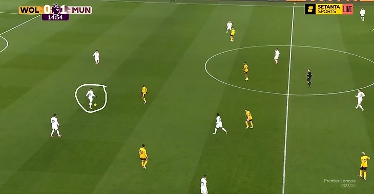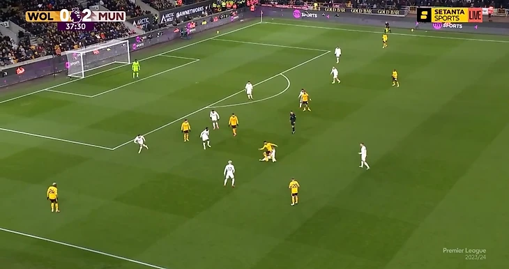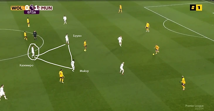 Манчестер Юнайтед закрывал программу 22-тура АПЛ игрой с Вулверхэмптоном в гостях. Посмотрев составы команд и увидев возвращения таких игроков как Мартинез в центр обороны и Каземиро в центр поля, сразу же захотелось посмотреть матч. Бразилец играл чистого опорного, причем даже не в паре с Майну или Бруно а исполнял что-то вроде «волнореза» перед четверкой обороны «дьяволов». Это кстати уже о многом говорит, что Тен Хаг совсем не стесняется ставить одного бразильца после травмы, ведь не стоит забывать, что в этой позиции надо успевать и в правый фланг, и в левый, а это колоссальный объем работы. Но по-видимому, несмотря на вроде с первого взгляда небольшой лишний вес, Каземиро готов к такому объему. Вот кстати картинка, подтверждающая построение МЮ в центре.