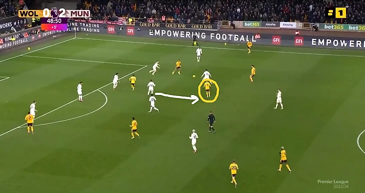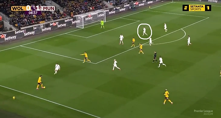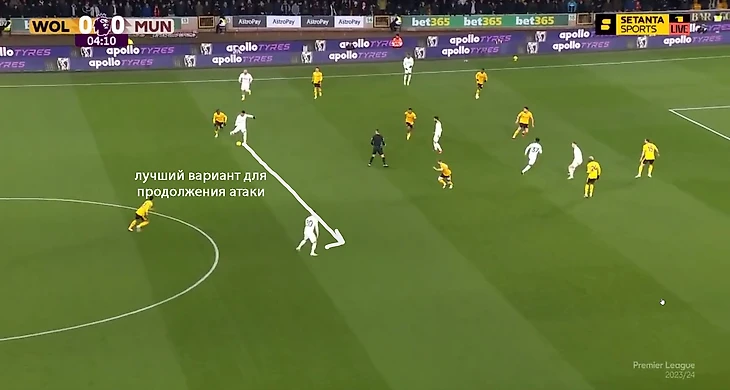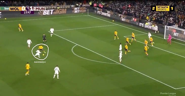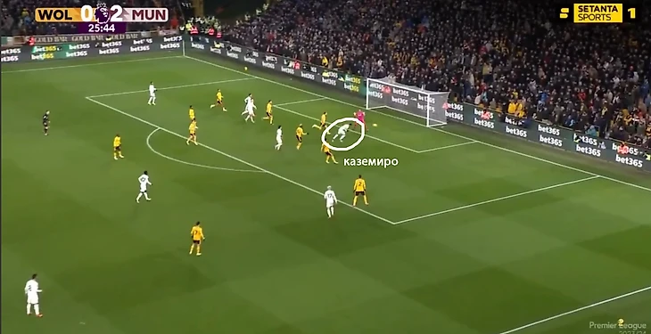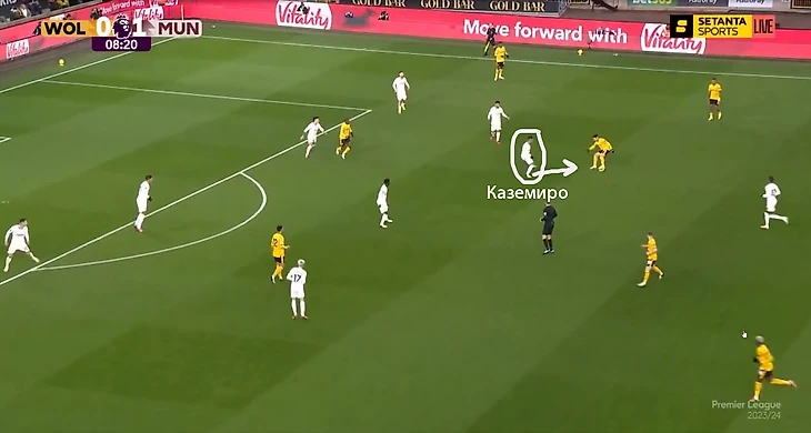Или вот еще момент, доказывающий вездесущность Каземиро. Мартинез зачастую выдвигался на игрока, который получал мяч, тем самым оголяя зону за своей спиной. Обратите внимание на действия Каземиро, который моментально садится в зону центрального защитника, пока аргентинец продолжает отбирать мяч. Тем самым делает идеальный баланс в обороне МЮ. Именно благодаря таким действиям нападающие «волков» очень плохо себя чувствовали на половине поля МЮ. В динамике все тут.
