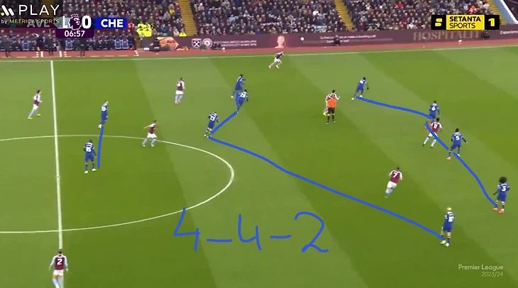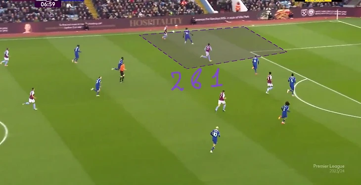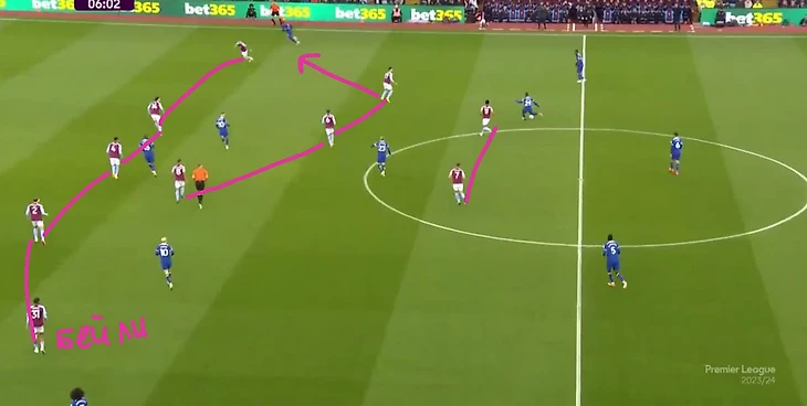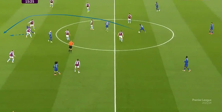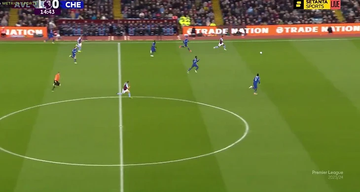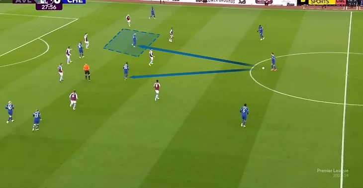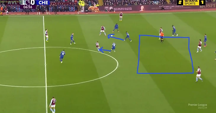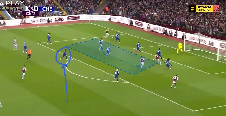 Челси надо было заходить по-другому. Во-первых растягивать оборону с фланга на фланга, чтобы появлялись промежутки между опорниками Астон Виллы, где Палмер или Мудрик в позициях инсайдов получали мячи. Вот смотрите, что я имею ввиду.