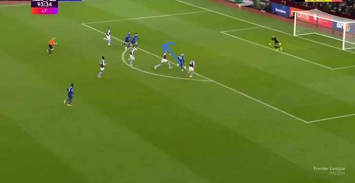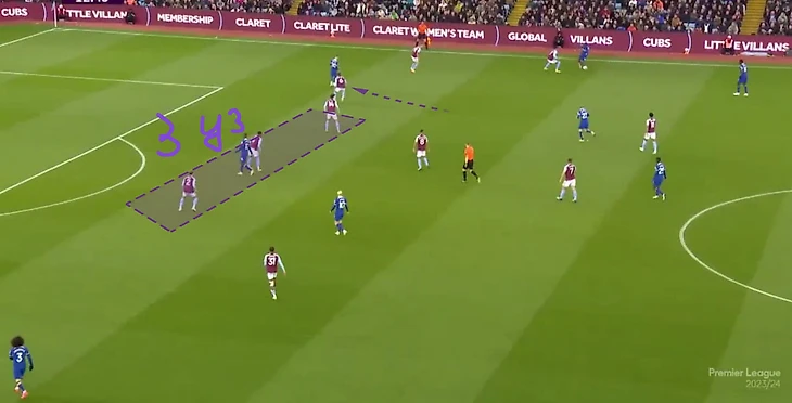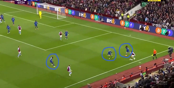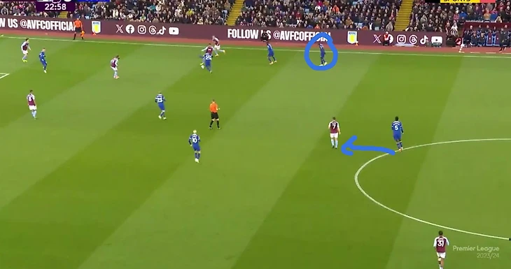 Вы спросите: а почему Челси не додумалось сделать также? Ну почему, додумалось, только у Астон Виллы, напомню, 3 центральных защитника и даже без опорников есть кому бежать за вбегающим. Хотя опорники итак успевали. Вот смотрите как это выглядело.