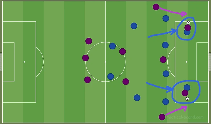 И вот в этой разнице вылазит вторая проблема Челси. Кто будет дорабатывать с вбегающими игроками, чаще всего инсайдами. Сейчас большинство команд делают такую комбинацию. И по задумке это должны делать опорники, в принципе логично и как вариант. Галлахер и Кайседо могут с этим справляться. Вот как это выглядело на доске с обоих флангов сразу.