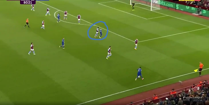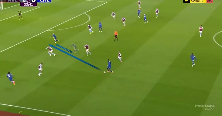 Вторым вариантом для Челси было использования забросов на все того же Джексона за спину защитникам. Все-таки у Астон Виллы одна из самых высоких по расположению линий обороны в лиге. И вот это бы сработало с передачи Кайседо, если бы господин Джексон не залез в офсайд.