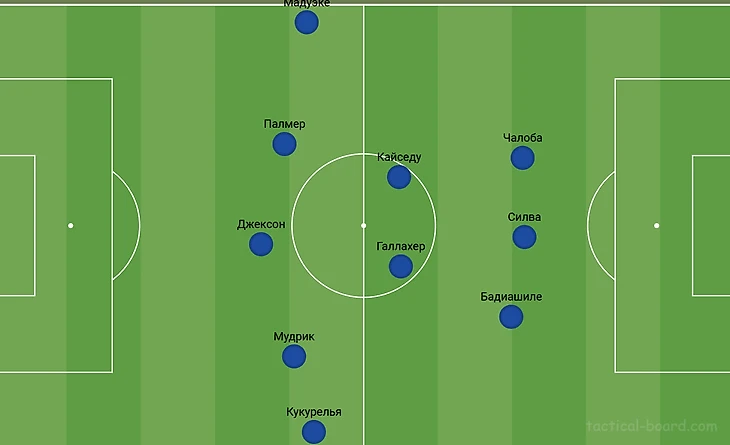 Переходим к расстановкам. В атаке обе команды играли очень похоже, по сути по одной структуре 3-2-5. Вот наглядно показал на доске как это выглядело у обоих команд, а также игроки, которые чаще всего занимали позиции в этих расстановках. У Челси Кукурелья поднимался выше, а Мудрик заходил в центр. Справа Мадуэке оставался в ширине, а Чалоба строил тройку сзади