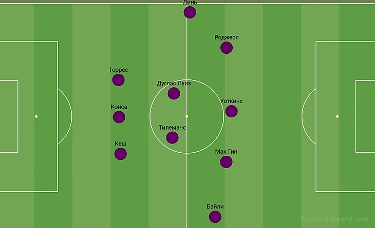 Ну и идентичная расстановка Астон Виллы. Динь поднимался в ширину, а Роджерс сужал в центр. Кеш формировал тройку, все остальные на своих местах плюс-минус.