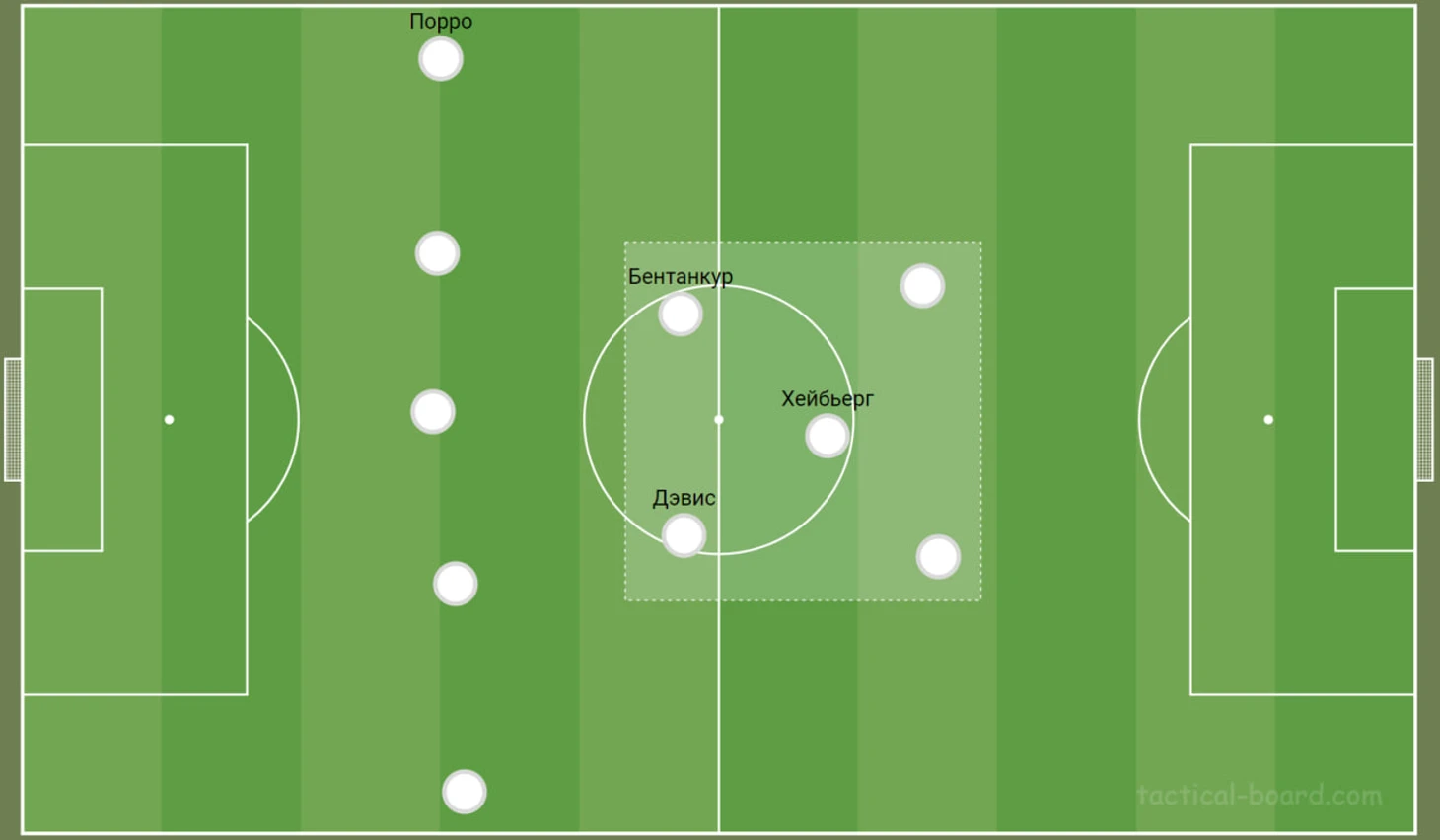 В теллеграм-канале есть данный материал в видеоформате. «Арсеналу» после победы над «Челси» предстояло еще одно испытание от Тоттенхэма. От «шпор» никогда непонятно, что ждать. Давайте посмотрим как канониры с ним справились. Начнем с Тоттенхэма, а именно с их расстановки в атаке. Их билдап в одно время и крут, но и очень рискованный. Давайте по порядку. Левый защитник Дэвис вместе с Бентанкуром образовывали пару опорных, только располагались они не сразу за двумя форвардами, как привычно видеть у всех команд, а чуть выше, почти в линию с полузащитниками соперника. Педро Порро поднимался в ширину и в верхней линии образовывалась пятерка игроков. Хейберг заходил в в центр этого образованного квадрата. Получалось что-то похожее на 2-1-2-5. Вот смотрите на доску.